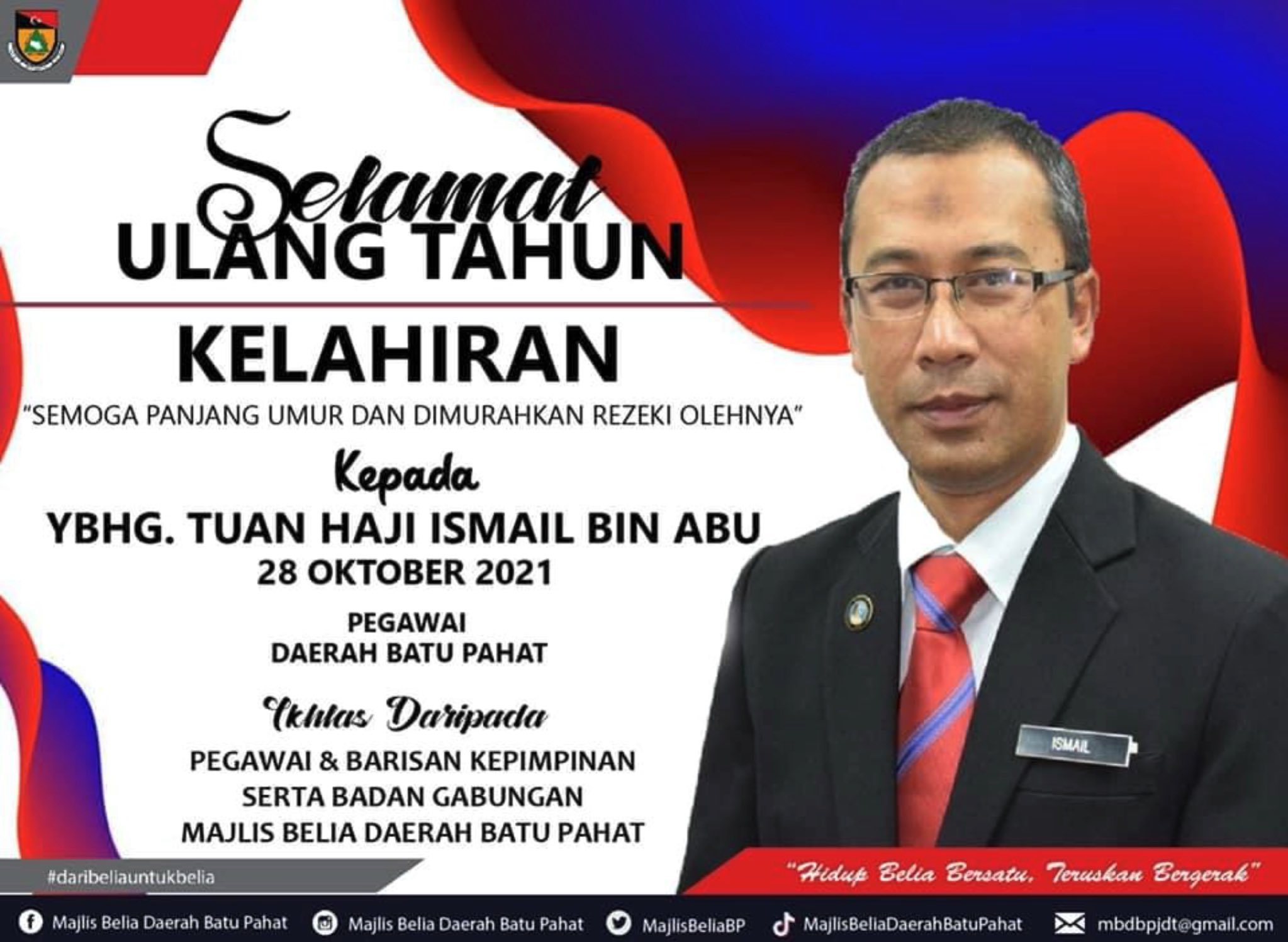 Majlis Belia Daerah Batu Pahat Twitter પર Hidup Belia Bersatu 28 Oktober 2021 Selamat Ulang Tahun Kelahiran 28 Oktober 2021 Kepada Ybhg Tuan Haji Ismail Bin Abu Pegawai Daerah Batu Pahat